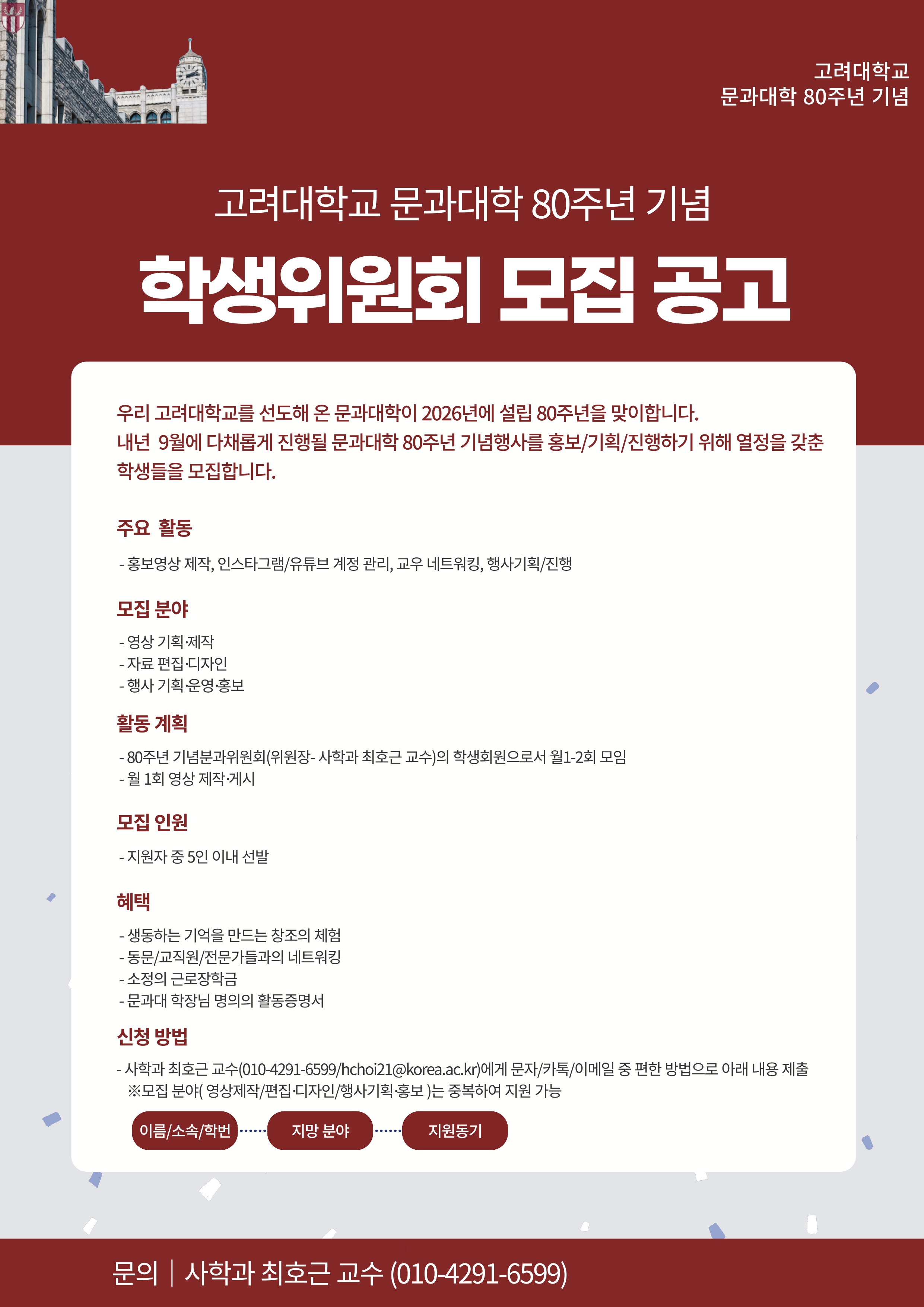 제목 | 고려대학교 문과대학 80주년 기념 학생위원회 모집 공고 |