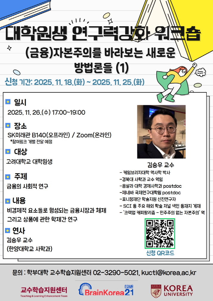 일정: 2025.11.26.(수) 17:00 ~ 19:00 장소: SK미래관 B140호/Zoom *신청자에 한해 링크 개별 전송 예정 강의 주제 : 금융의 사회적 연구 대상 : 해당 주제에 관심 있는 대학원생 연사 : 김승우 교수(한양대 사학과) 신청 링크: https://forms.gle/JCSAJZXpfNPWbEMt7 인문학의 질적 연구방법론에 대해 관심을 갖고 계신 대학원생 여러분들의 많은 지원 바랍니다.