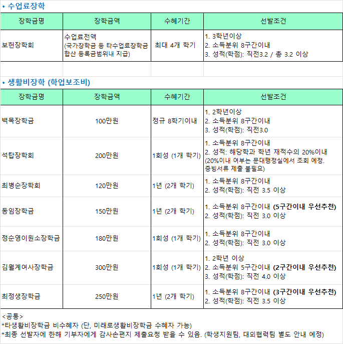 4] 생활비 장학금은 국가장학금 및 타 수업료 장학금과 중복 수혜 가능.