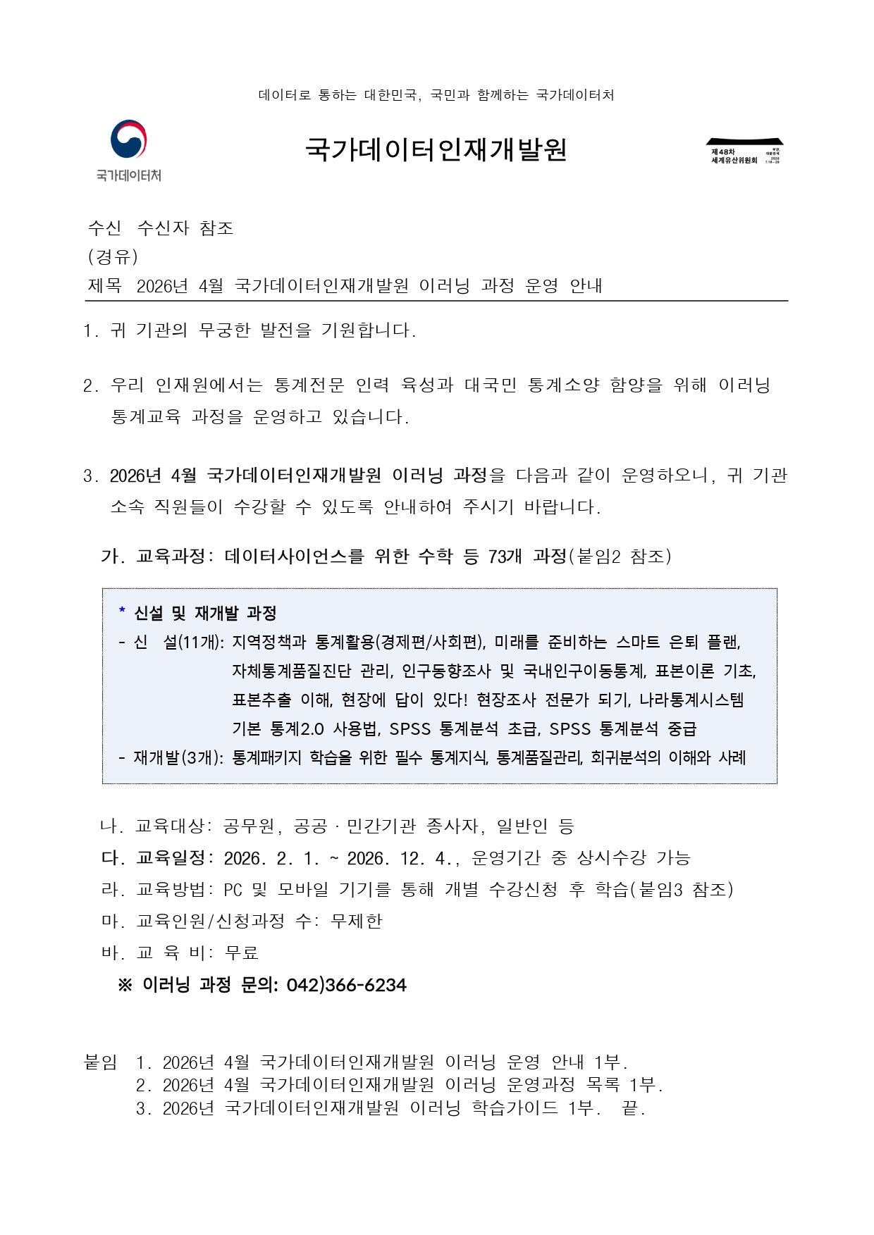 | 제목 | [국가데이터처] 2026년 4월 국가데이터인재개발원 이러닝 과정 운영 안내 |